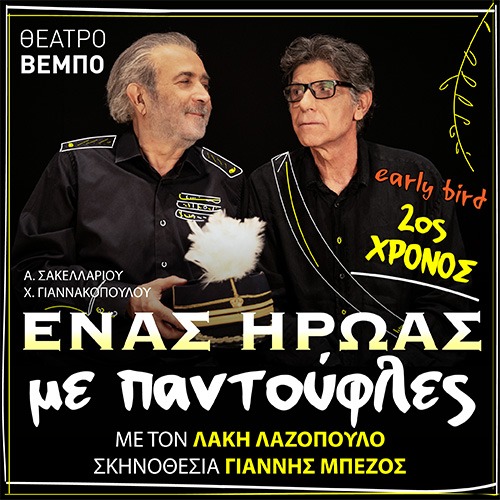 ![]() "ΕΝΑΣ ΗΡΩΑΣ ΜΕ ΠΑΝΤΟΥΦΛΕΣ" ΘΕΑΤΡΟ "ΒΕΜΠΟ" ΚΥΡΙΑΚΗ 28 ΔΕΚΕΜΒΡΙΟΥ ΤΙΜΗ : 45 € |